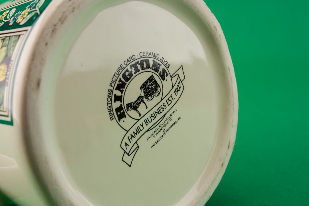 Charming Modernist jug with Rington's Picture Card pattern in pottery, great for serving water at the dinner table, by Eastgate Potteries; vintage English late 20th century.